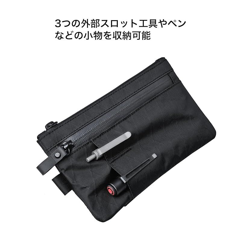 【ミニマリストに嬉しいデザイン】コンパクトで手に馴染みやすいサイズながら、十分な収納力を備えているため、ミニマリストの方にぴったりのアイテムです。手で持つのはもちろん、ズボンのポケットやバッグの中にもすっきりと収まります。左側のループには「ハンドストラップ(付属)」を取り付けることも可能です。内側は落ち着いたグレーのナイロン素材で、まさにミニマリスト好みのスタイリッシュなデザインです。