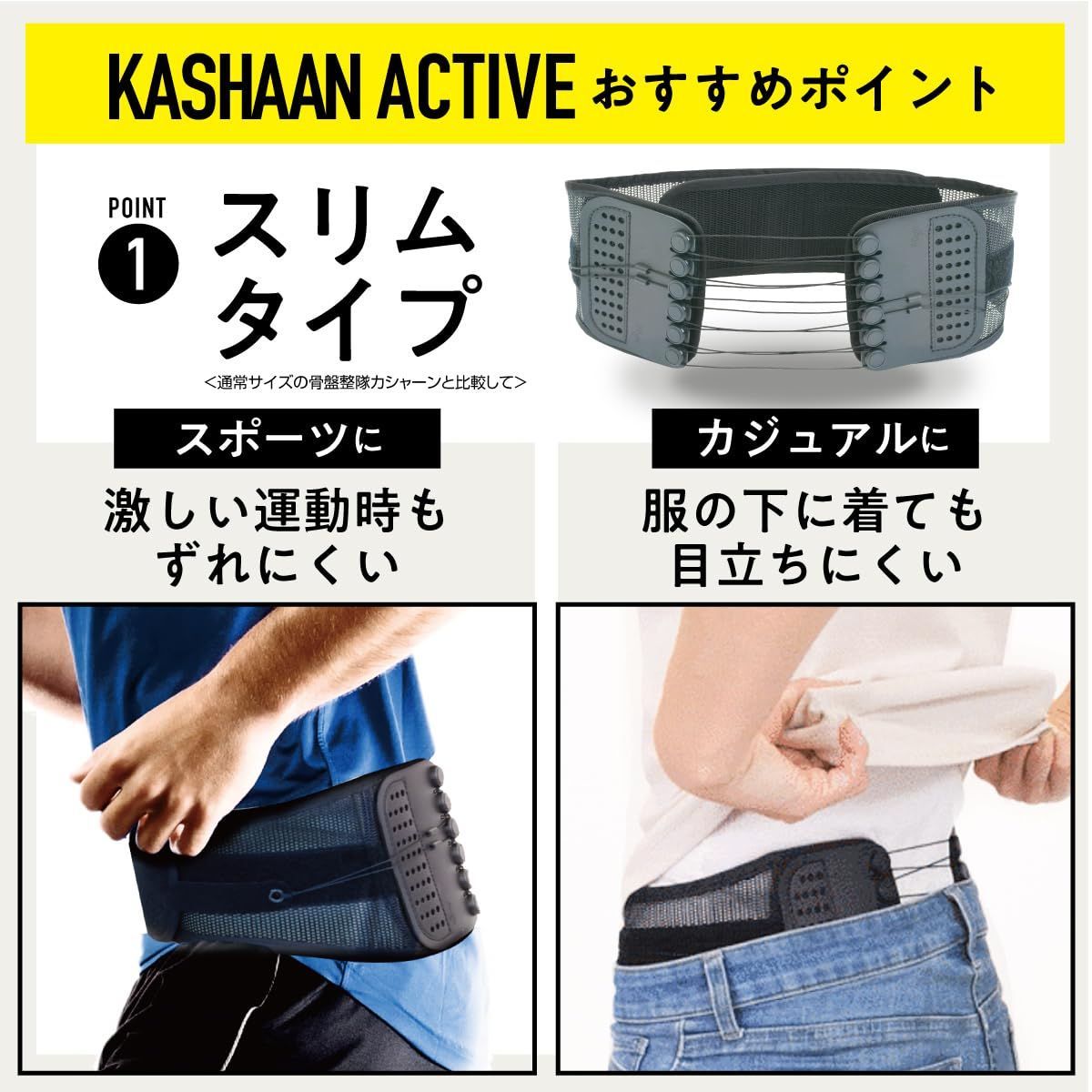 日常生活の腰のお悩みと骨盤ベルトのお悩みを解決する 「骨盤整隊カシャーンactive」 一度つけたらもうやみつき!