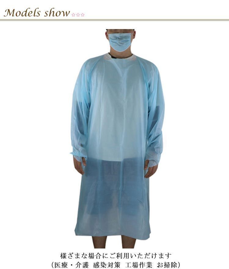 CPEガウン 食品工場 200点セット 指フック エンボス加工 ブルー 袖付き 親指フック式 プラスチックガウン 使い捨てエプロン 男