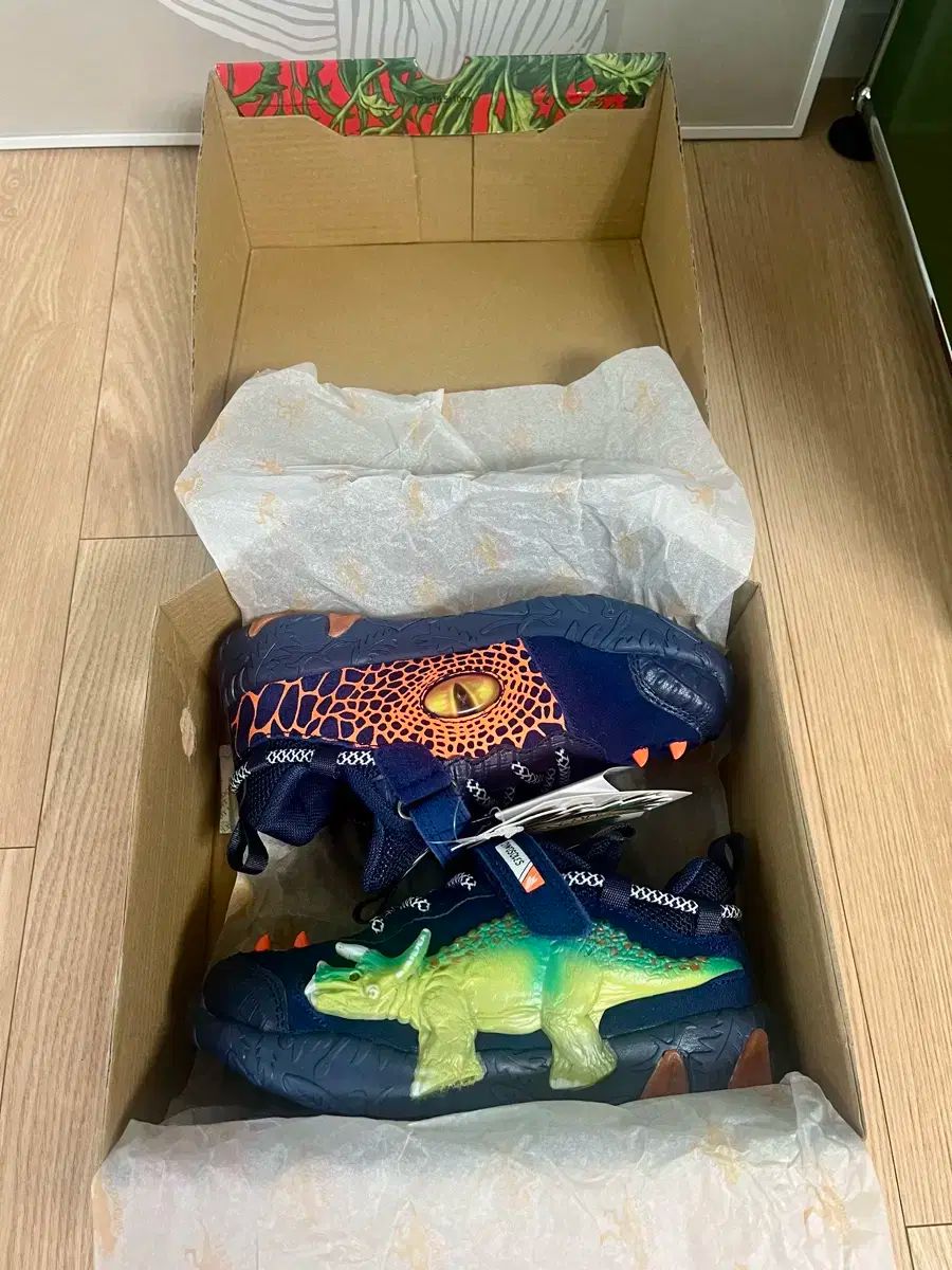靴の側面にはトリケラトプスのモデルがあるので、子供たちも気に入ると思います。