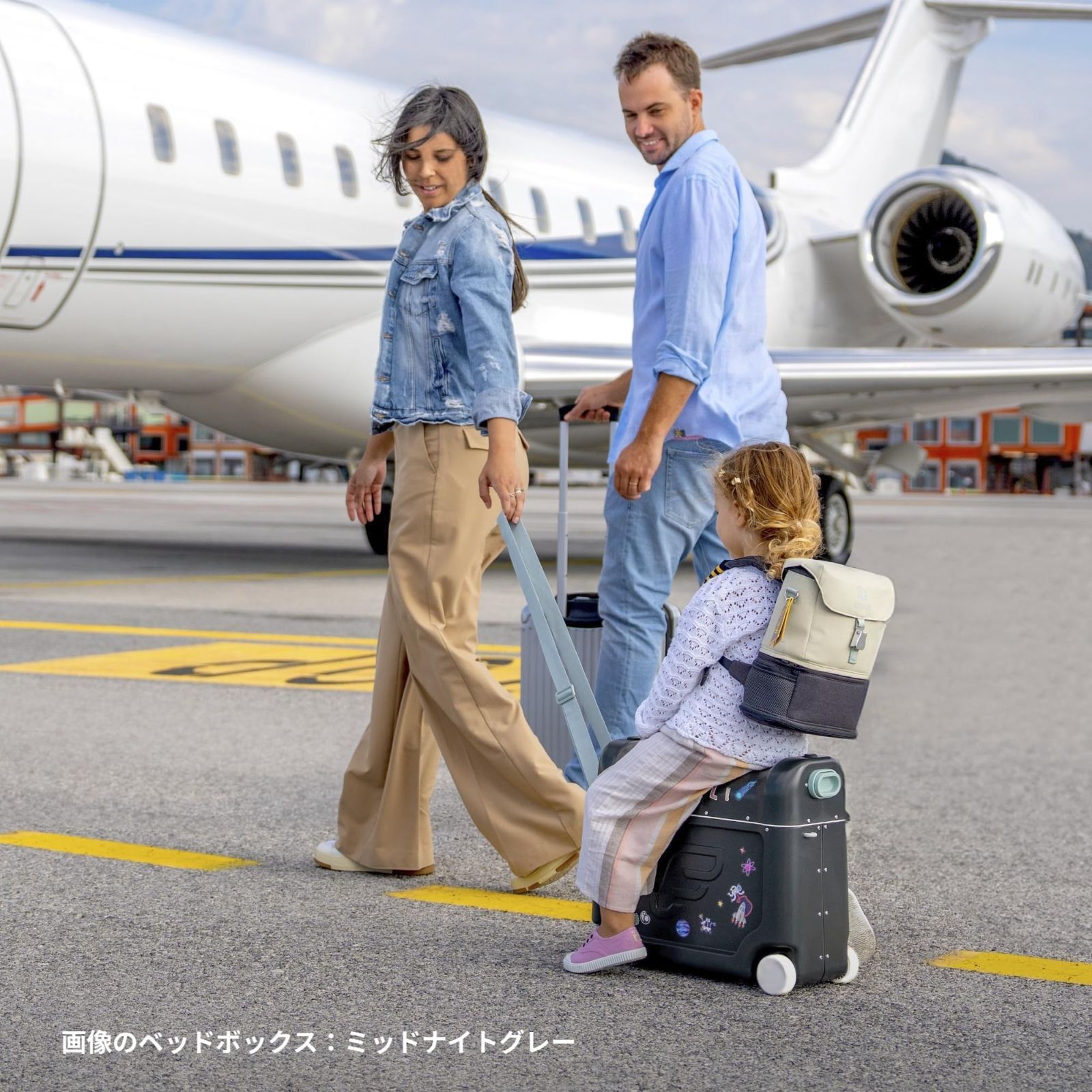 ライドオン可能な子ども用スーツケースと、機内や列車の座席をフラットにできるベッドセットがひとつに。