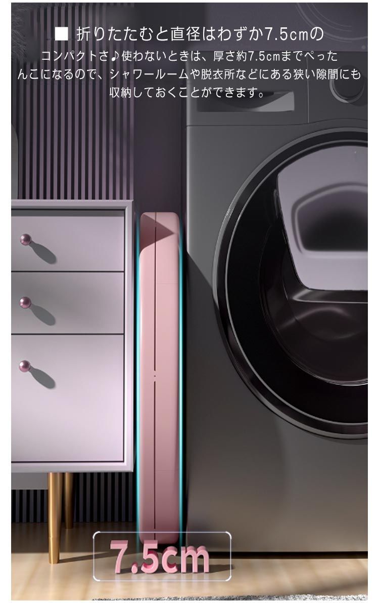 使わないときは、厚さ約7.5cmまでぺったんこになるので、シャワールームや脱衣所などにある狭い隙間にも収納しておくことができます。