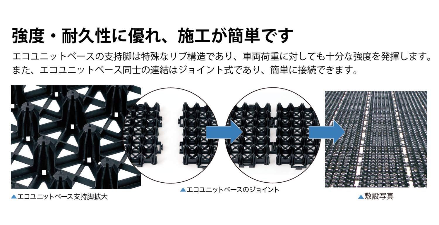 地球温暖化防止に駐車場を緑化しませんか?緑化駐車場にはエコユニットベースがおすすめです!! エコユニットベースは、再生ポリプロピレンを使用した緑化駐車場に最適な芝生保護材です。 製品寸法:525mm×525mm×70mm 色:緑 重量:1.9kg/枚 耐荷重:10t車以下 耐寒性:-10度 耐熱性:100度 材質:再生ポリプロピレン 数量:4枚 (1.1平米分)
